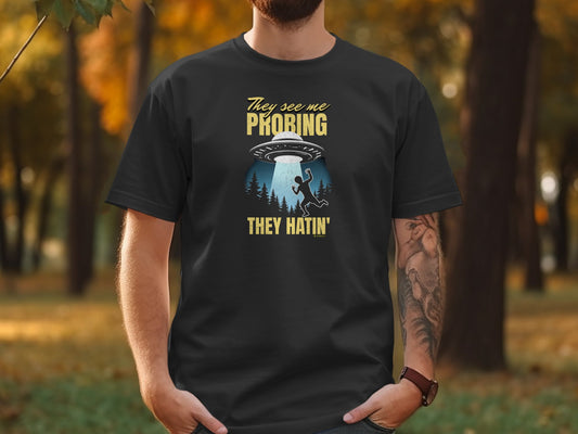 Funny Alien UFO Unisex T-shirt, Extraterrestrial Space Tee, Cosmic Graphic Shirt, Outer Space Clothing, Alien Abduction Apparel